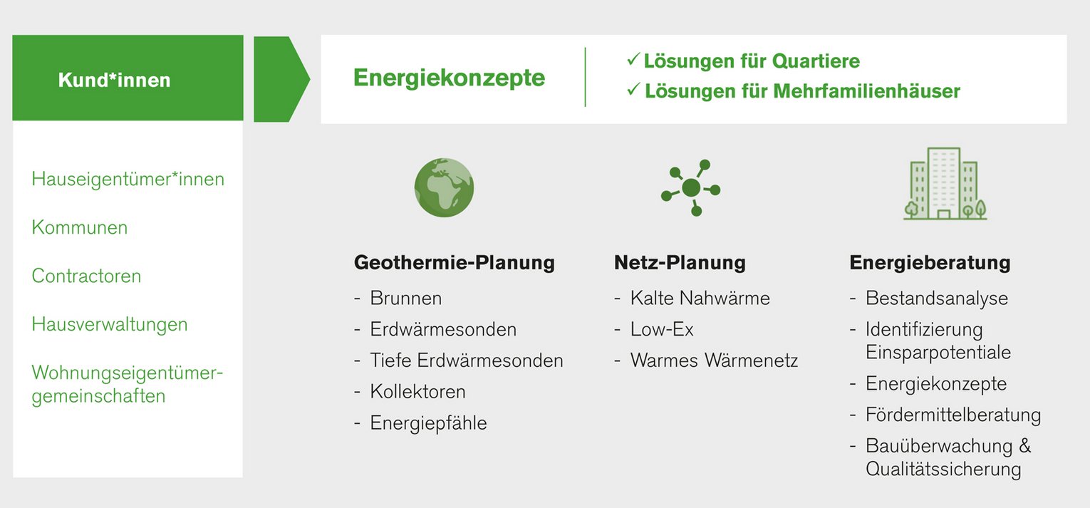 Wir bieten Systemlösungen für Quartiere und Mehrfamilienhäuser, für Eigentümer von Wohngebäuden, Wohnungseigentümergemeinschaften, Hausverwaltungen, Contractoren und Kommunen. Zudem unterstützen wir Kommunen bei der kommunalen Wärmeplanung mit unserer Fachexpertise im Bereich Geothermie.