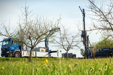 Jetzt erkunden wir den Untergrund genau. Je nachdem, ob infolge des Grundwasservorkommens eine Brunnenanlage in Frage kommt oder ob es in Richtung Erdsondenanlage geht, werden die Bohrtiefen festgelegt. Dann unternehmen wir eine oder mehrere Erkundungsbohrungen. Bei Brunnenanlagen wird ein Pumpversuch durchgeführt. Bei Erdsondenanlagen findet eine Pilotbohrung mit einem sogenannten Thermal Response Test (TRT) statt. Dieser gibt Aufschluss über das thermische Untergrundverhalten. Die dafür benötigte Pilotbohrung wird übrigens bei der Umsetzung des Projekts integriert, so entstehen keine Mehrkosten.