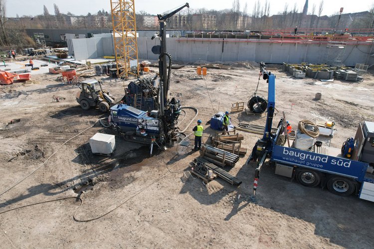 Die Sondenfelder sind in 2 Abschnitte geteilt, die sich zum großen Teil unter den Gebäuden befinden. Aufgrund des engen Bauzeitenplans mussten die Bohr- und Anschlussarbeiten eng getaktet zwischen Bohrpfahlgründung und Verlegung der Bodenplatte erfolgen. Für einen optimierten Ablauf fanden parallel zu den Bohrarbeiten die Anschlussarbeiten statt. Zeitgleich wurde das kalte Nahwärmenetz verbaut. Gebohrt wurde mit dem Verfahren direkter Spülbohrungen mit Wasser, teilweise mit umweltverträglichen Zusätzen zur Bohrlochstabilisierung und Verbesserung der Bohreigenschaften. Das Verfahren ist gängig bei sandigem Lockergestein, welches für Berlins Untergrund typisch ist und sich auch unter dem Bauareal befindet.